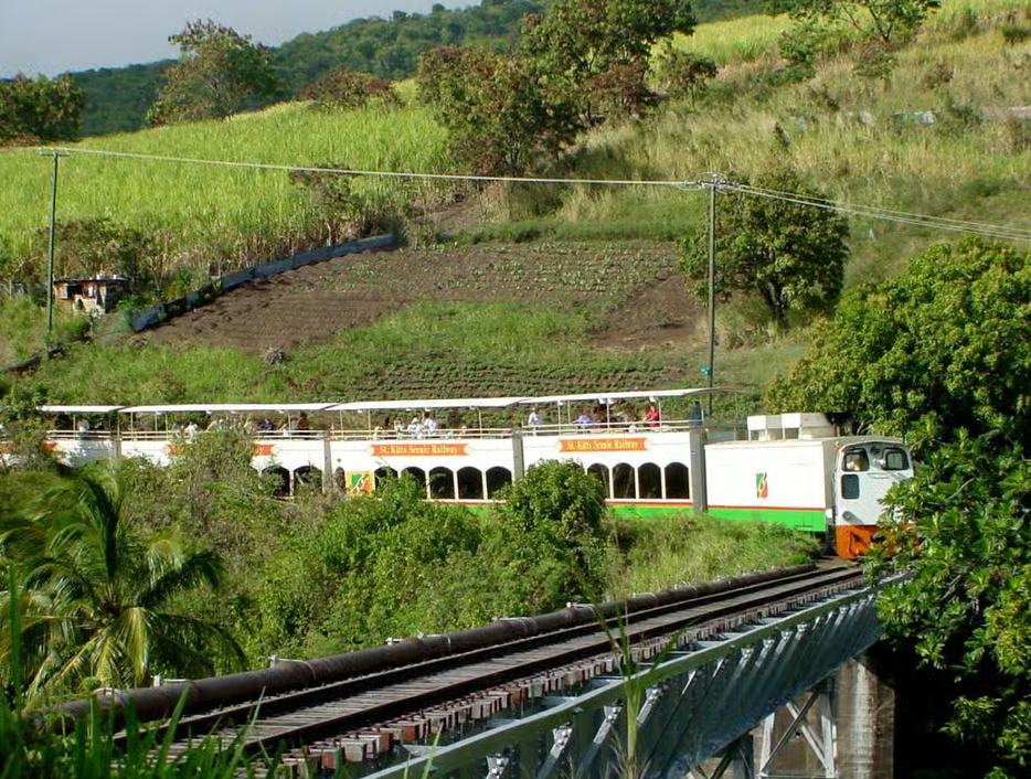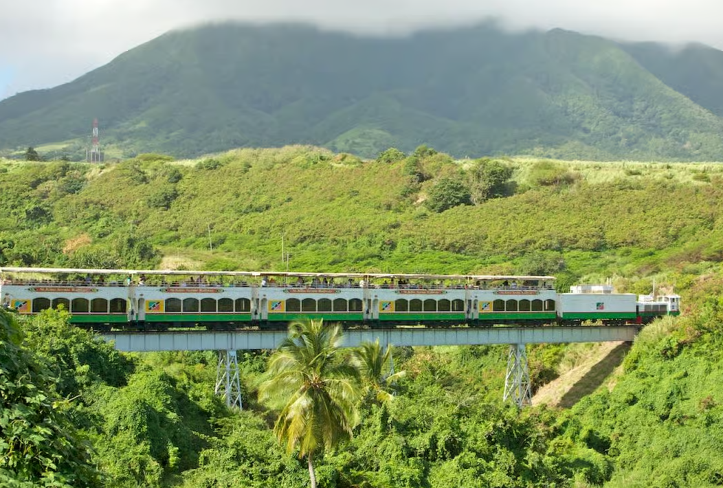 Cross tall steel bridges spanning deep canyons and make your way through small villages and farms. See dark green rainforests skirted by rippling fields of sugar cane, with the volcanic cone of Mt. Liamuiga rising above the railway.